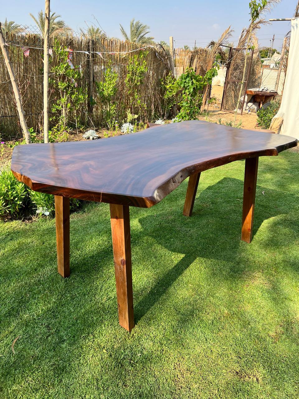 A wide and expansive dining table with a deep chocolate finish and a heavy natural grain that flows across a broad, organic silhouette.