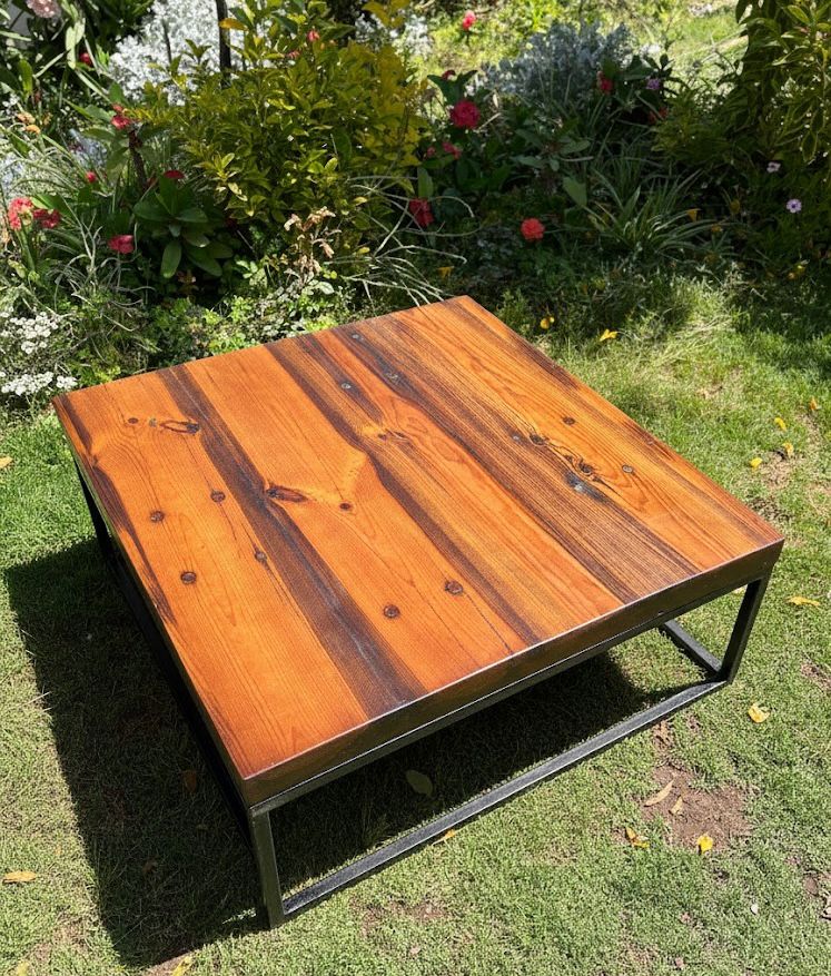 A robust, square coffee table featuring a thick solid wood top with high-contrast linear grain patterns and natural knots, securely framed by a minimalist black metal industrial base.
