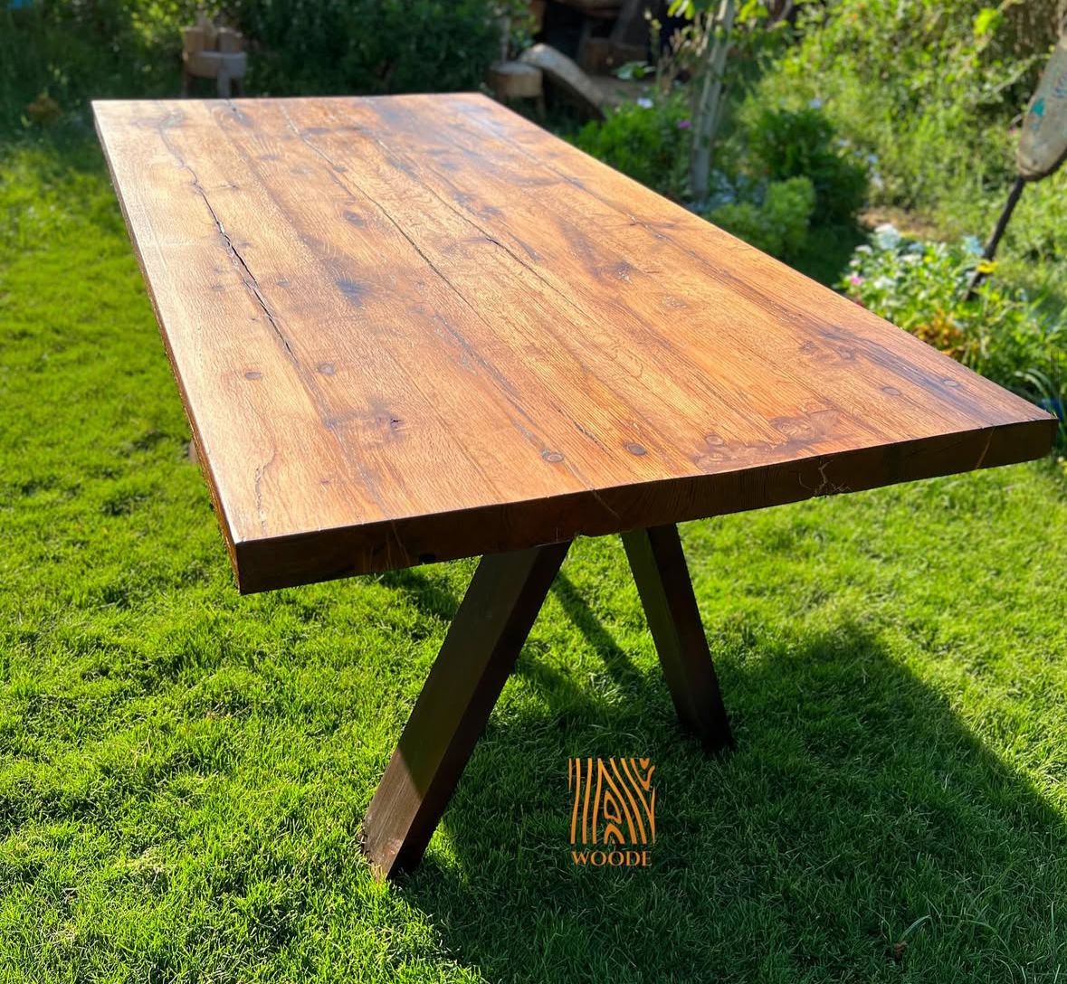 The Amber Horizon is a masterful blend of rustic warmth and industrial strength, designed to be the heart of your dining room. This table features a wide, hand-finished solid wood top that glows with golden honey tones, showcasing a rich tapestry of natural knots and fine grain lines. Supported by bold, matte-black architectural legs, its expansive surface offers a rugged yet refined aesthetic that invites long conversations and family gatherings. It is a timeless foundation for the modern home that appreciates the beauty of the outdoors.