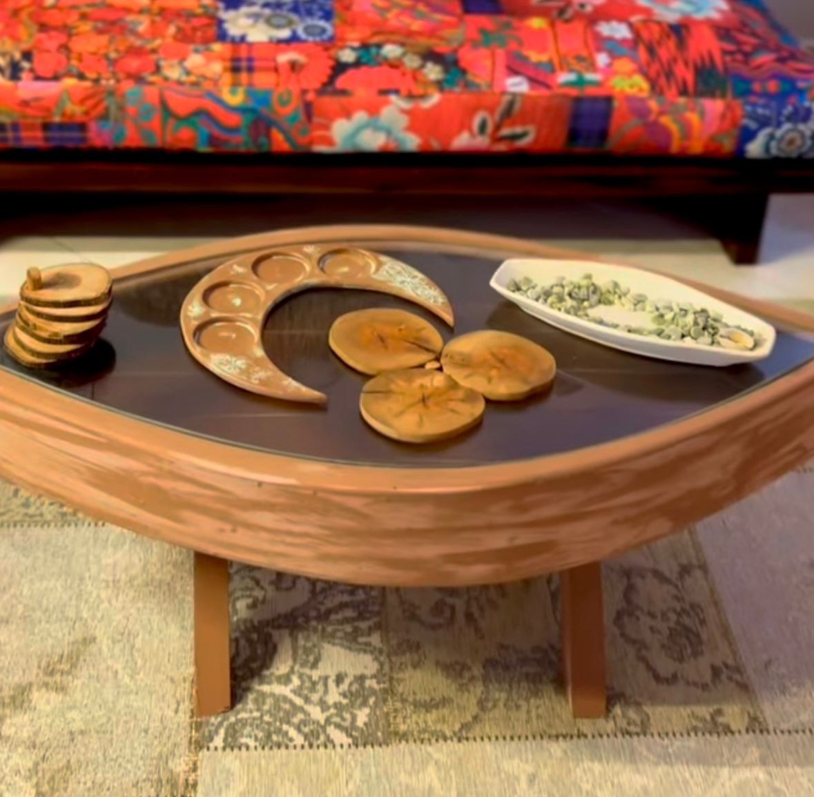 The Celestial Eye is a handcrafted center table designed to be the focal point of any living space. Its unique, organic silhouette is carved from premium wood, embracing a sleek glass inlay that adds a layer of modern transparency to its rustic charm. The smooth, sweeping curves of the frame highlight the natural grain, while the sturdy, tapered legs provide a grounded stability. This table isn't just furniture; it is a conversation piece that bridges the gap between artisan craftsmanship and contemporary art.