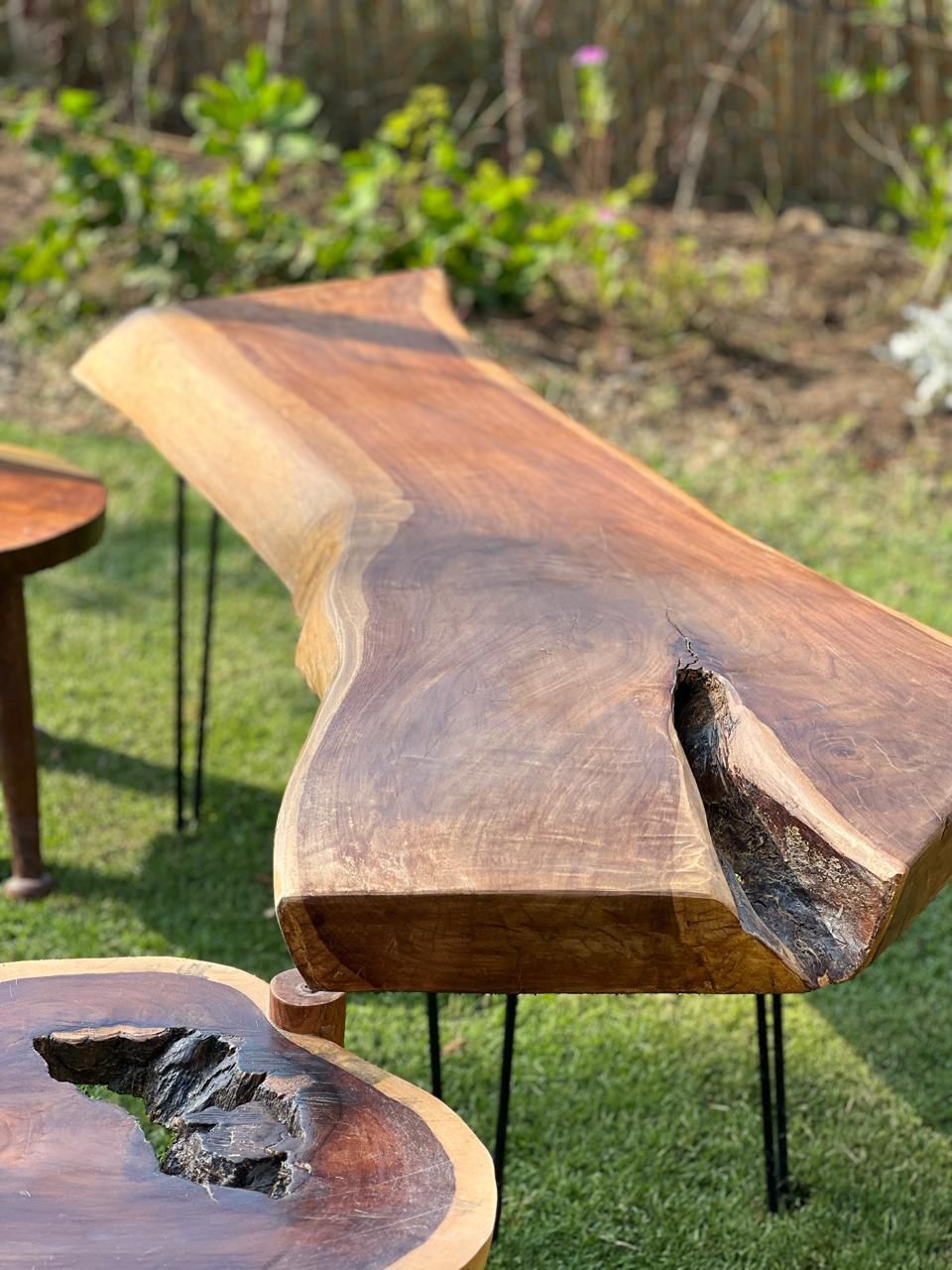 A long, sweeping live edge slab table featuring a deep mahogany heartwood that flows into a pale golden outer ring, defined by a dramatic natural split at one end and supported by minimalist black metal legs.