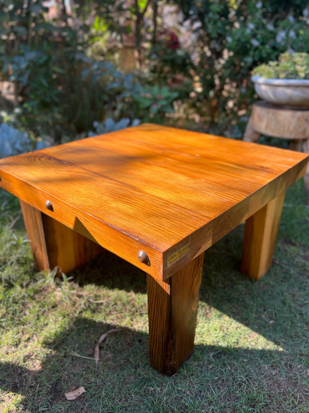 A solid low profile coffee table featuring a bright honey finish and industrial copper bolt accents on a thick square timber frame.