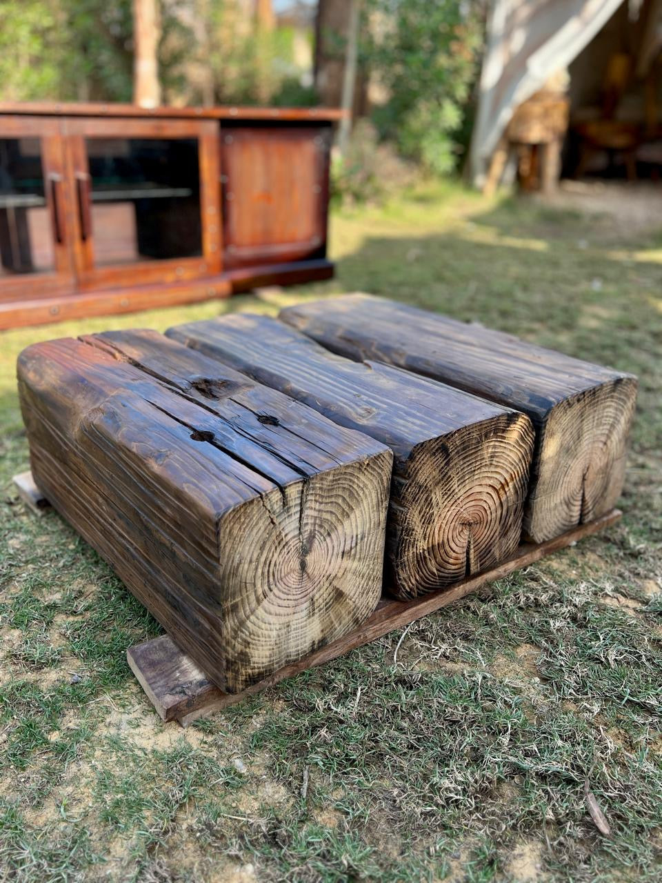 Three monumental segments of reclaimed heartwood that celebrate the raw, geometric strength and deep annual rings of the forest floor.