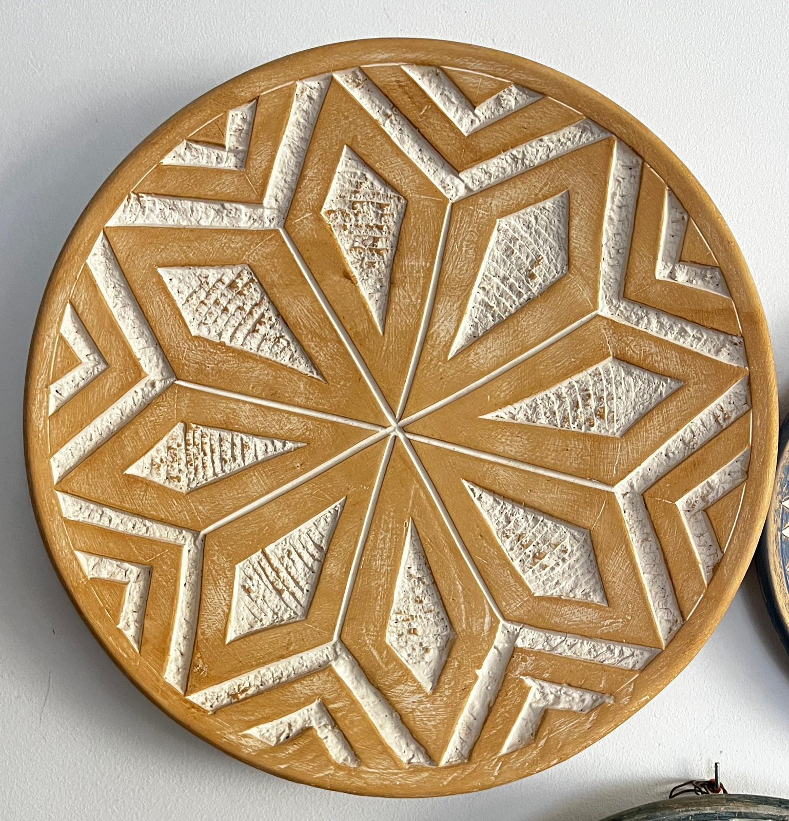 A stunning, hand-carved wooden relief featuring a bold geometric flower with textured chalk-white petals. This sun-drenched piece blends clean architectural lines with raw, organic finishes for a perfect modern-boho statement.