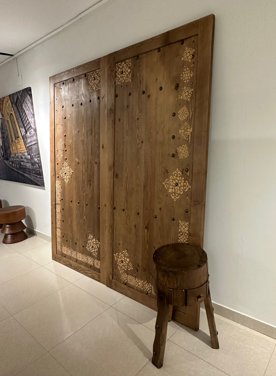This solid wood sliding door features a deep rustic grain and a substantial rectangular frame that encloses two large vertical panels. The surface is intricately decorated with light-toned stenciled floral patterns and a series of dark metallic studs that create a vintage Mediterranean aesthetic while maintaining a sturdy and functional presence in a modern home.