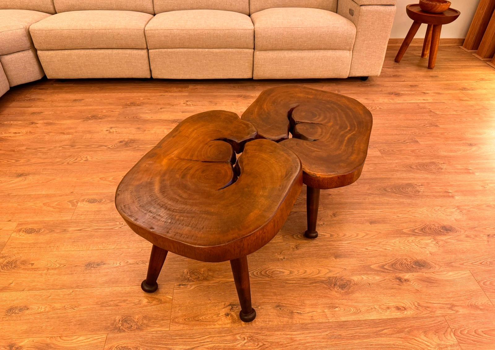 These two interlocking coffee tables carved from thick, organic wood cross-sections with a deep amber finish. Each tabletop features prominent natural cracks and split details that add a raw, sculptural character to the smooth polished surfaces, all supported by sturdy dark-toned tapered legs.