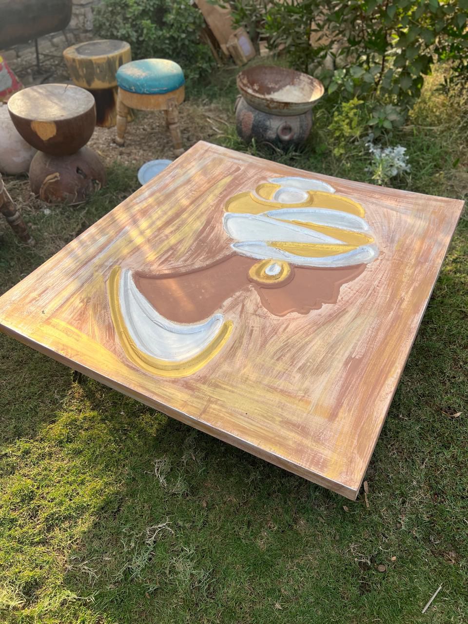A square low-profile table featuring a textured artistic relief of a woman in a golden headdress, finished with shimmering metallic accents and soft brushstrokes.
