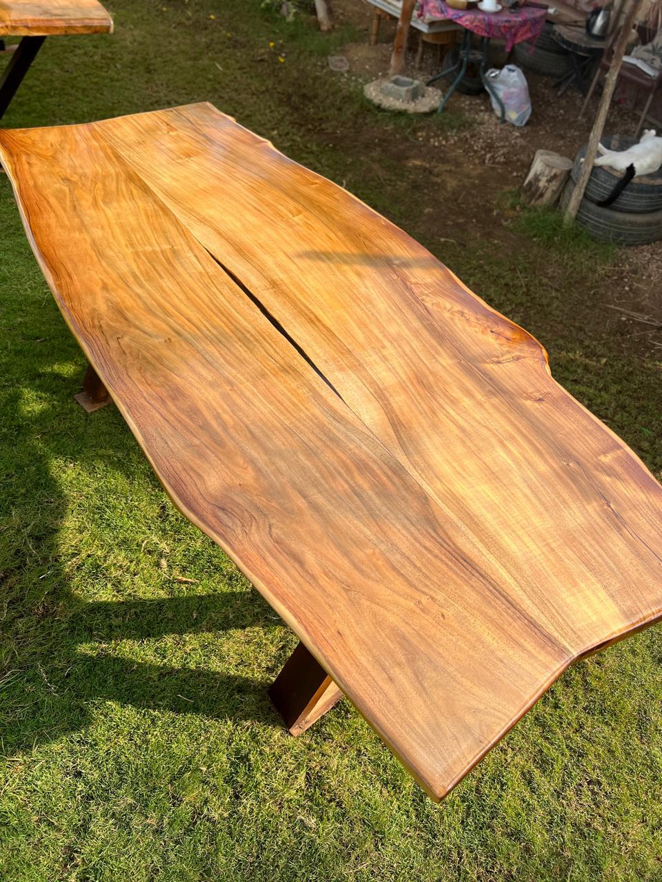 A long dining table with a smooth honey finish and a natural live edge that follows the graceful, wavy lines of the original tree trunk.