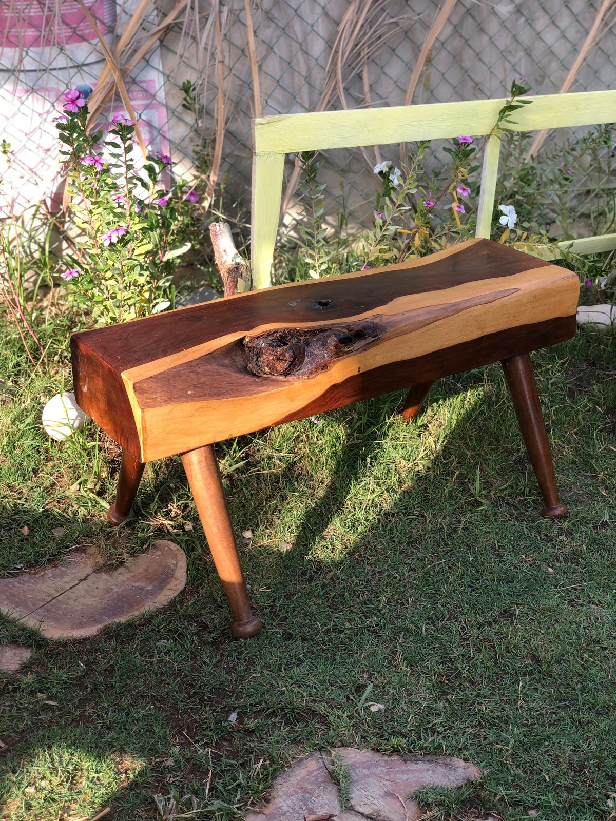 A solid, block-style bench featuring a thick dual-toned timber with a prominent natural burl and tapered legs for a sturdy yet elegant look.