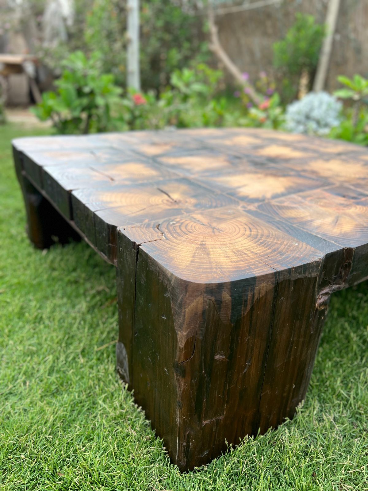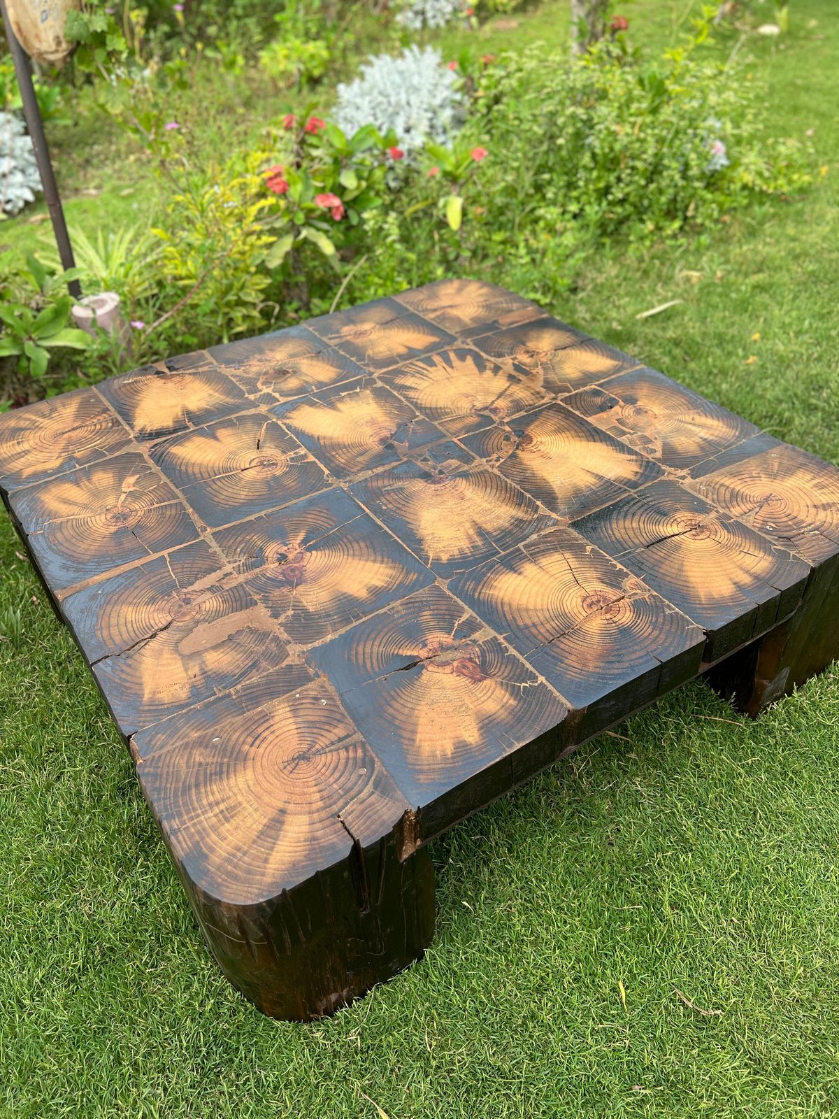 A low square coffee table composed of multiple cross-cut timber sections that reveal a stunning grid of natural rings and dark charred edges for a bold geometric look.