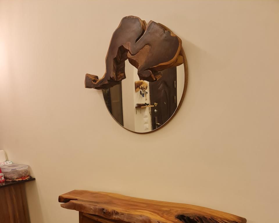 A stunning live-edge mirror featuring a raw, sculptural wood frame that partially overlays the glass. This one-of-a-kind piece blends wild, organic textures with a modern reflection to create a bold focal point.