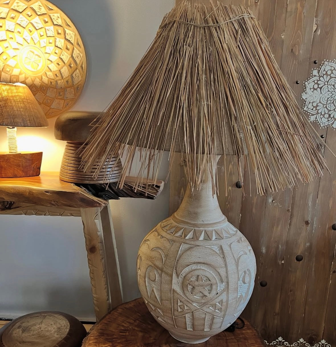 The Desert Echo captures the serene, sun-bleached beauty of an arid landscape. Hand-carved from wood with a weathered, bone-white finish, its base features deep-relief carvings that play with light and shadow, while the untamed, straw-thatched shade adds a rustic, wind-swept texture. This piece is perfect for those looking to add a touch of "Organic Modern" or "Boho-Chic" to their space, acting as a quiet but powerful statement of artisanal craft.