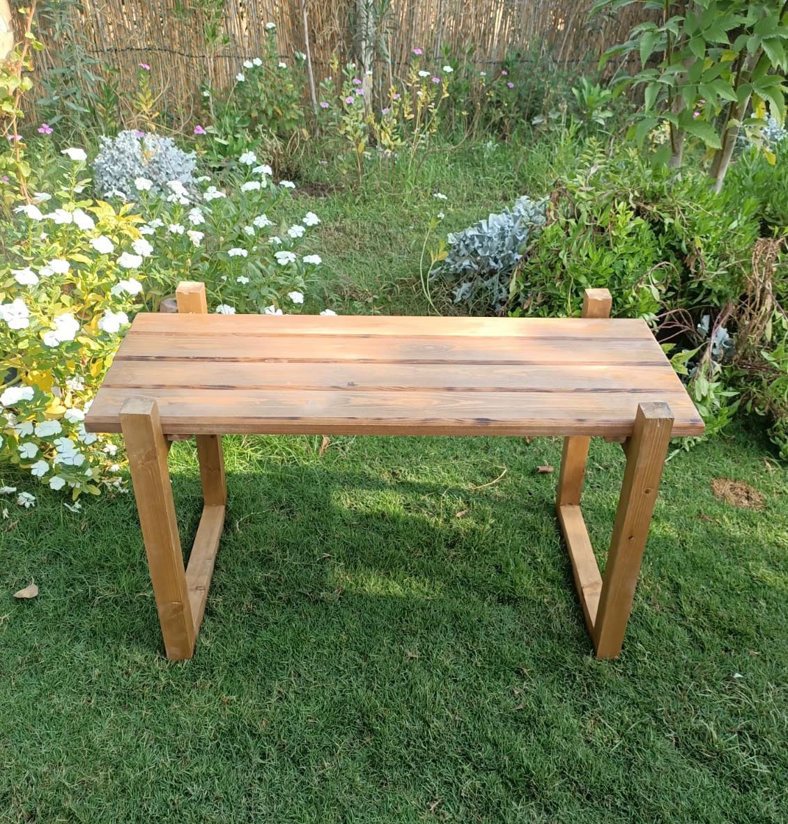 This light wood table features a rectangular top made of several parallel slats that create a clean and rhythmic surface. The piece is supported by a unique architectural base consisting of two squared frames that extend slightly through the tabletop.