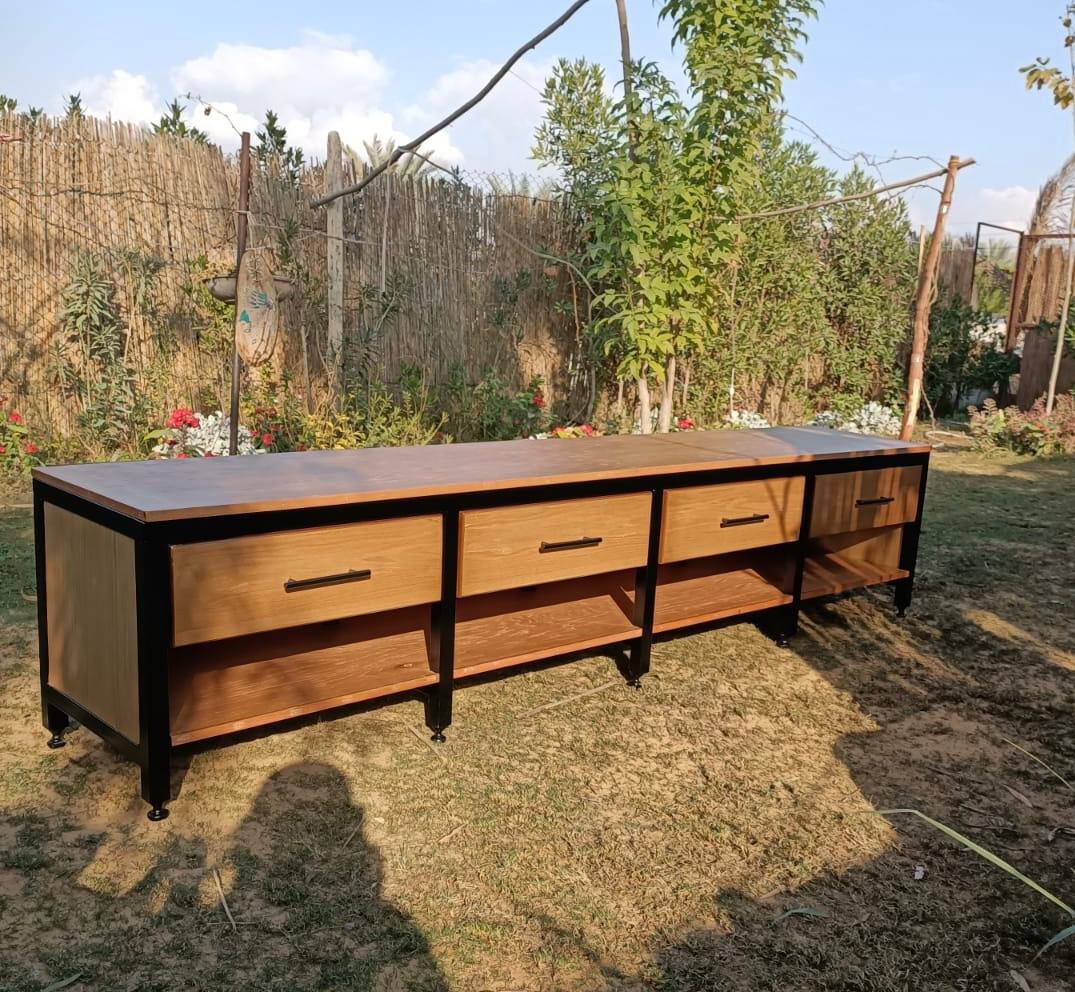 This elongated industrial TV unit features a sleek black metal frame that houses four spacious wooden drawers and open lower shelving. The smooth wood panels provide a warm contrast to the dark minimalist structure, while the slim black legs elevate the piece for a modern, airy look in any living space.