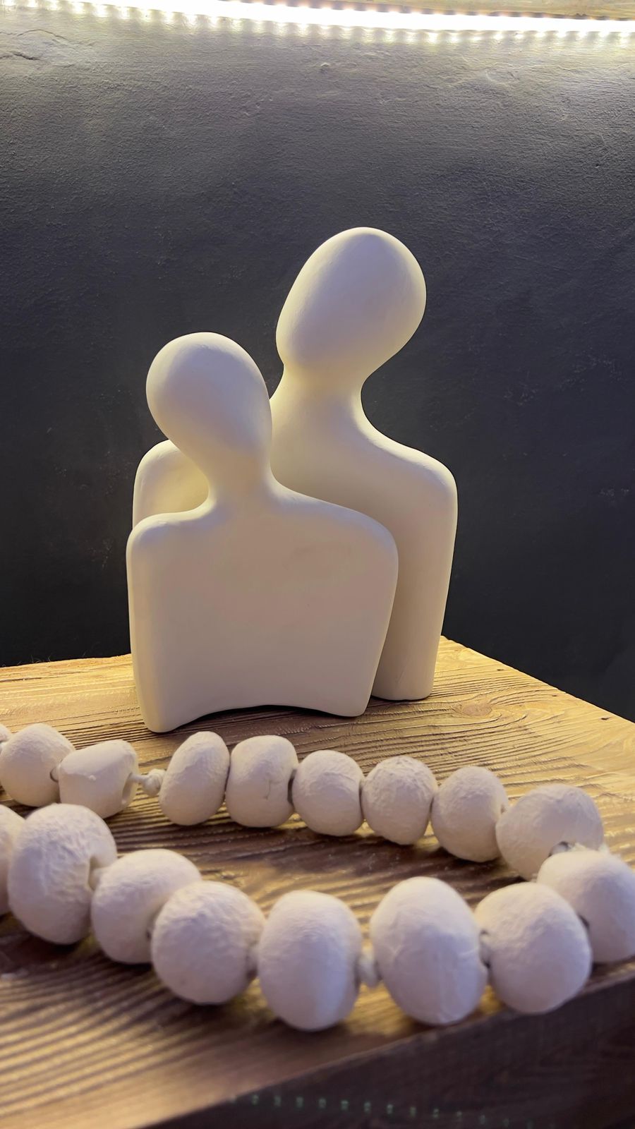 A set of two smooth, matte white figurines featuring soft, rounded silhouettes that lean toward each other, creating a minimalist representation of companionship and quiet support.