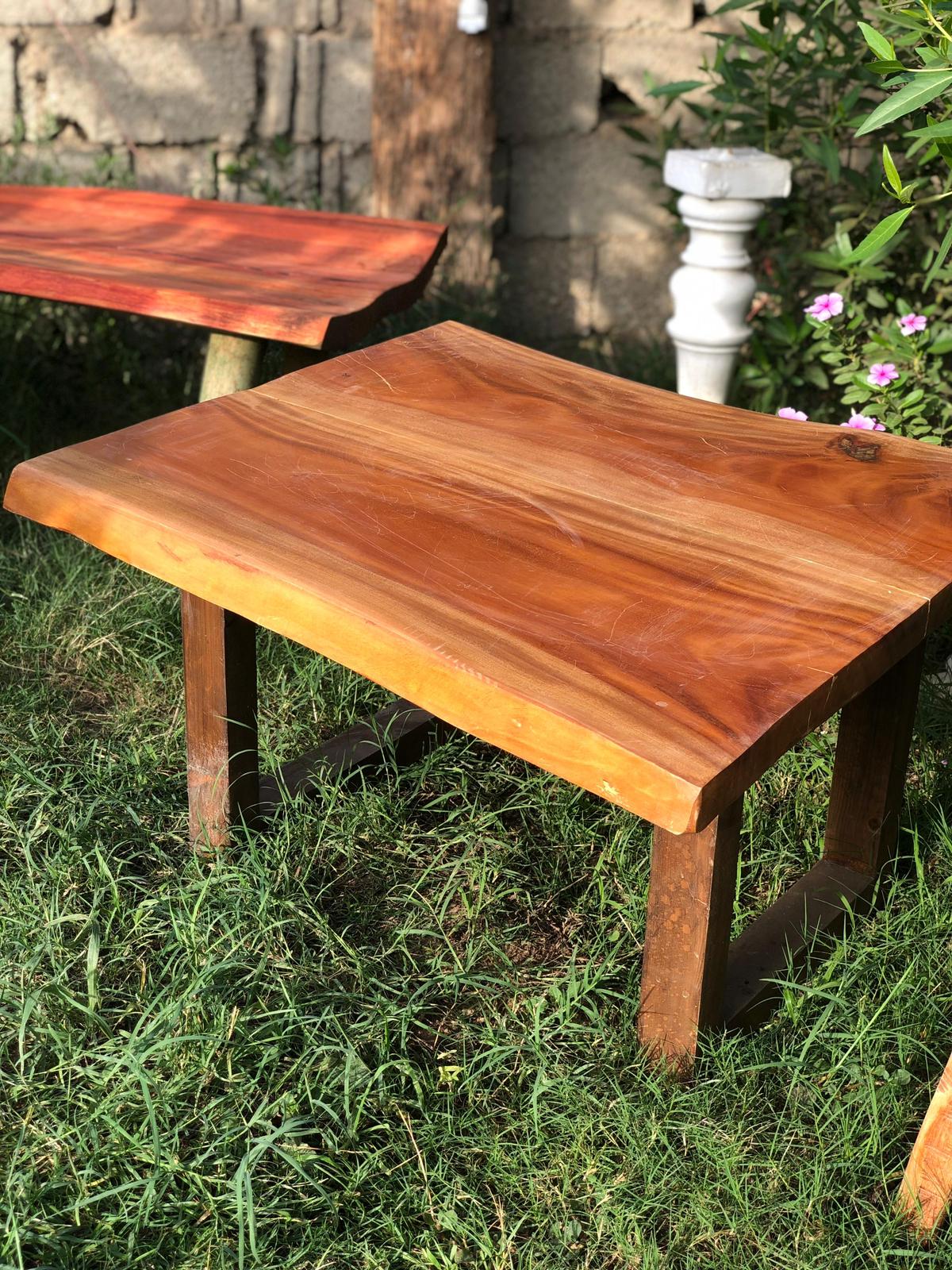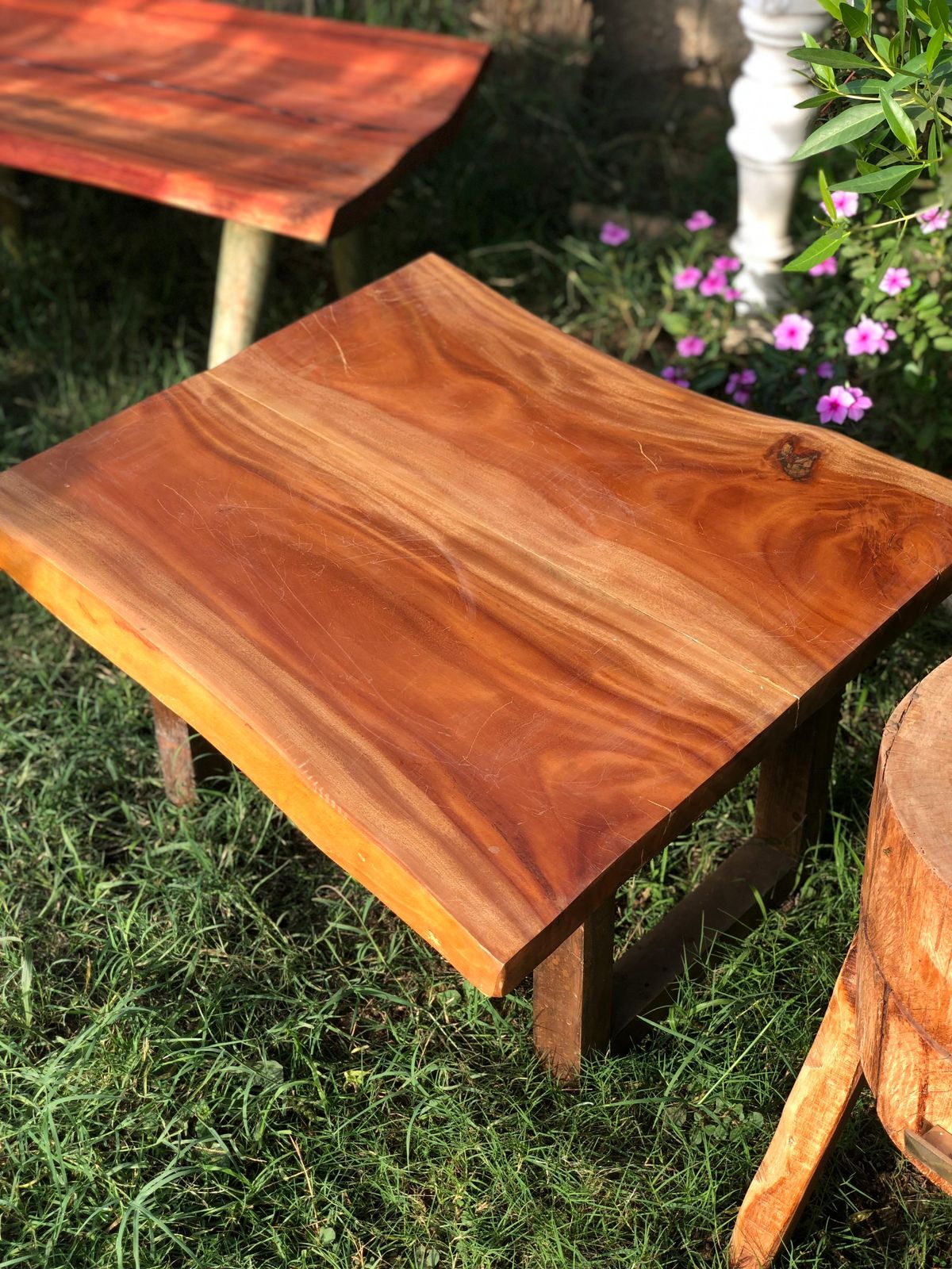 This low rectangular coffee table features a vibrant honey-toned wood surface with organic wavy edges. The polished top showcases a deep swirling grain that flows into a dark rich heartwood plume, supported by minimalist dark-stained block legs for a sturdy grounded feel.