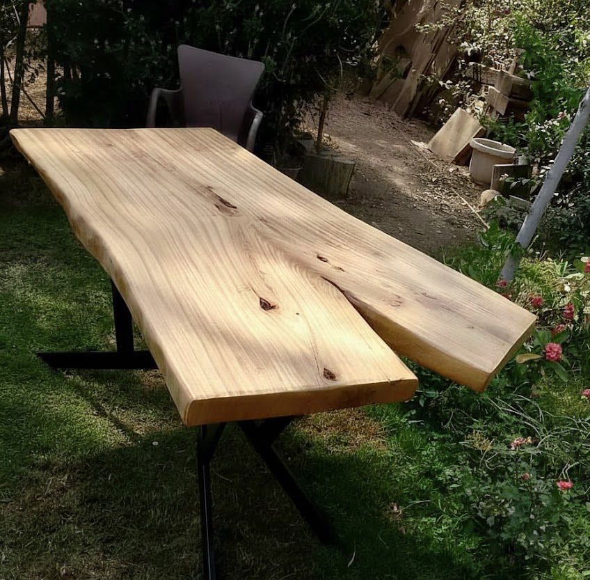 Two natural slabs moving together as one, highlighting the raw grain and honest beauty of the wood.